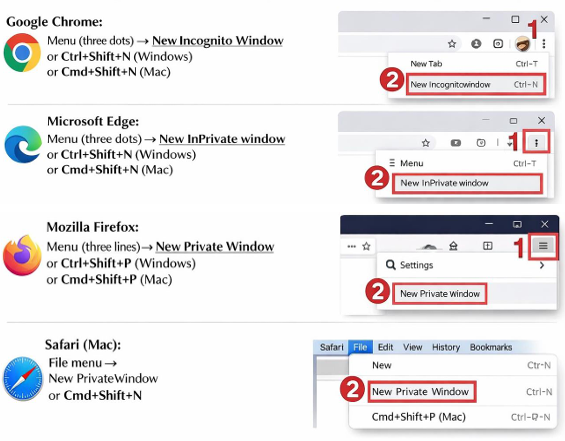 Important: Open Private/Incognito Window. Follow instructions below depending on your Browser.