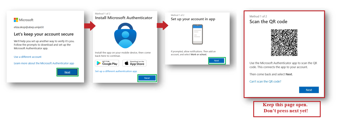 - When page with QR code will appear, keep this page open. Don’t press next!