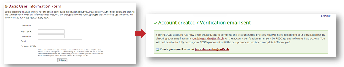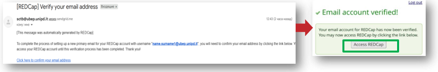 - Open the verification email from REDCap. Click the provided link. Pop up window will appear saying “Email account verified!”