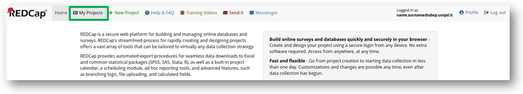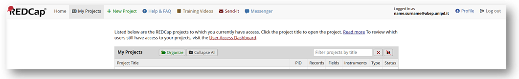 - The system will then redirect you and in the screen that appears, you will be in the REDCap Home page.