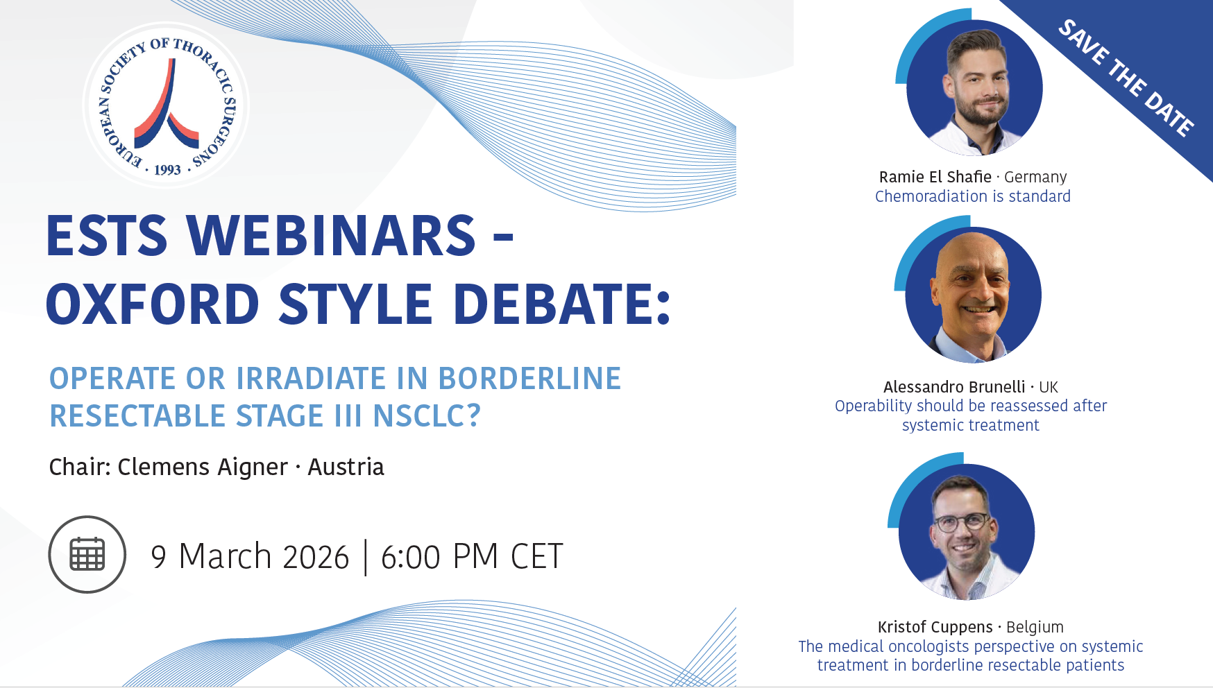 Home EventsCalendar ESTS Webinar: Operate or Irradiate in Borderline Resectable Stage III NSCLC? ESTS Webinar: Operate or Irradiate in Borderline Resectable Stage III NSCLC? Download Event to Calendar Event The European Society of Thoracic Surgeons (ESTS) is delighted to extend a warm invitation to an engaging and thought-provoking webinar: Operate or Irradiate in Borderline Resectable Stage III NSCLC? An Oxford-Style Debate Date: 9 March 2026 Time: 6:00 PM CET Chair: Clemens Aigner (Austria) Ramie El Shafie (Germany) - Chemoradiation is standard Alessandro Brunelli (UK) - Operability should be reassessed after systemic treatment Kristof Cuppens (Belgium) - The medical oncologists perspective on systemic treatment in borderline resectable patients Please click here to register This event is awaiting approval for CME View other Events