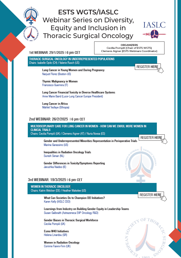 Home News & Announcements ESTS WGTS/IASLC Webinar Series ESTS WGTS/IASLC Webinar Series You are invited to participate in the "WGTS/IASLC webinar series on Diversity, Equity and Inclusion in Thoracic Surgical Oncology" On behalf of the organisers, Cecilia Pompili and Clemens Aigner, we hope you can join us. Program Flyer: /_userfiles/pages/files/ests_wgts_iaslc.pdf Webinar 1, Wednesday 29th January 2025 THORACIC SURGICAL ONCOLOGY IN UNDERREPRESENTED POPULATIONS Registration link: https://us06web.zoom.us/webinar/register/WN_3MhG31IQRpeQtC3mEKBidw#/registration Webinar 2, Wednesday 26th February 2025 MULTIDISCIPLINARY CARE FOR LUNG CANCER IN WOMEN - HOW CAN WE ENROL MORE WOMEN IN CLINICAL TRIALS Registration link: https://us06web.zoom.us/webinar/register/WN_ZQT6ZTzASxGxsy7CHo833Q#/registration Webinar 3, Wednesday 19th March 2025 WOMEN IN THORACIC ONCOLOGY Registration link: https://us06web.zoom.us/webinar/register/WN_b6-ytoN-S_WSP3gqhdIWPg#/registration View other News Articles